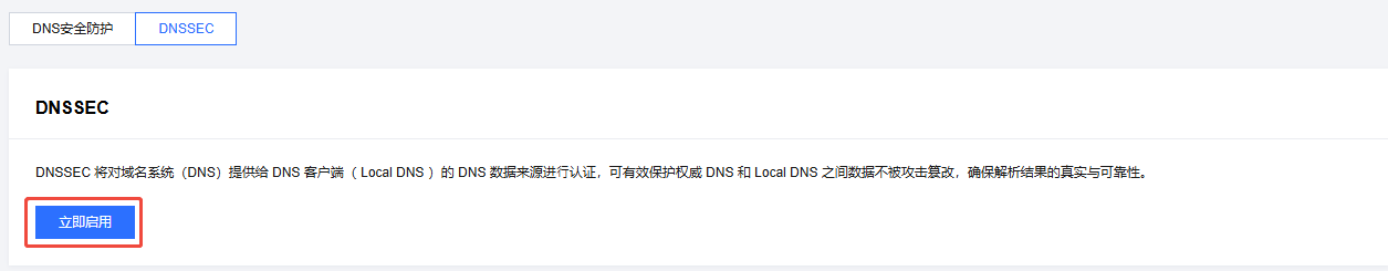 4. 在 DNS 安全页面中,单击 DNSSEC,单击立即启用。如下图所示: