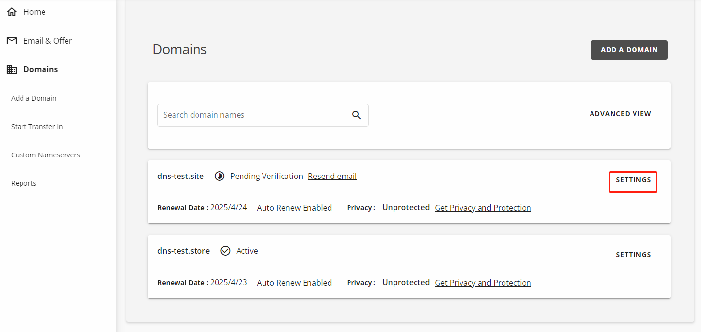2. 在您要设置 DNS 服务器的域名上选择 SETTINGS。如下图所示: