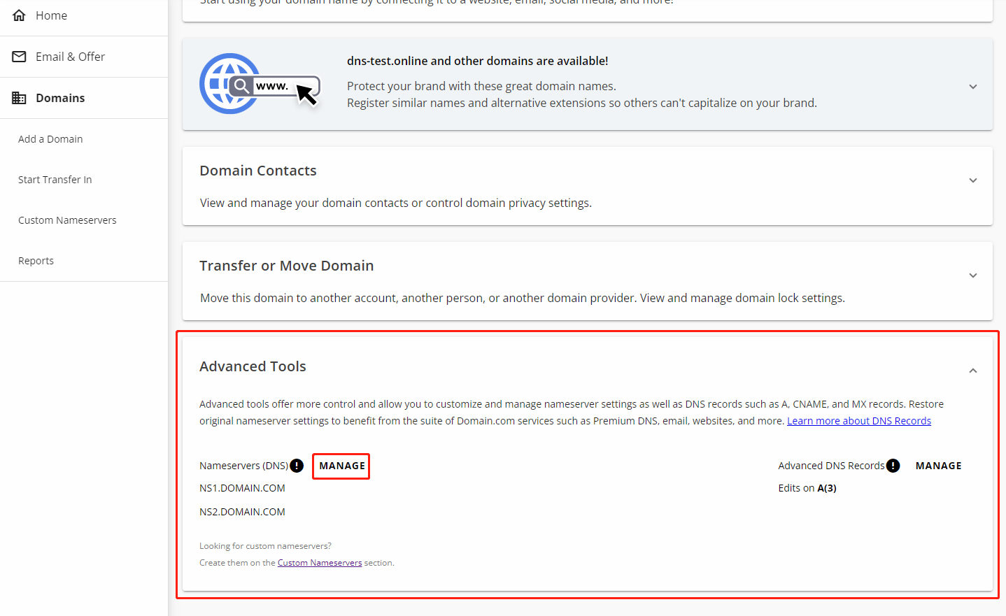 3. 在域名管理页中,选择 Advanced Tools卡片,单击 Nameservers (DNS) 字段旁边的 MANAGE。如下图所示: