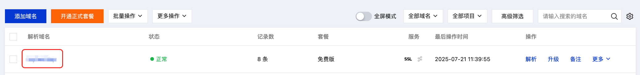 2. 在我的解析中,选择需要进行修改记录的域名,单击操作栏的解析,进入该域名的记录管理页面。如下图所示: