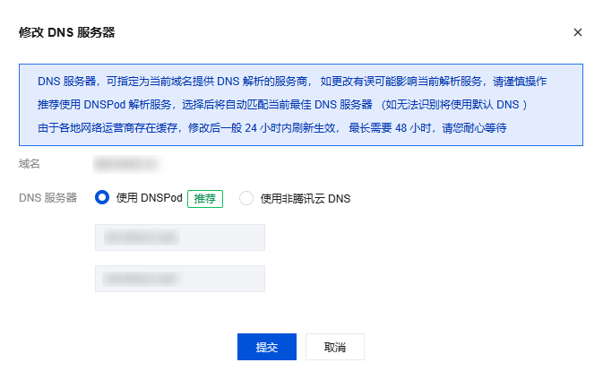 如果域名在腾讯云注册,或者已转入腾讯云,可以通过以下步骤修改 DNS 服务器: