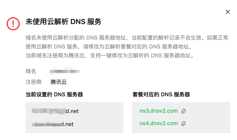 如果您的域名在腾讯云注册,在弹出的未使用云解析 DNS 服务窗口中,单击一键修改,即可一键修改为正确的 DNS 服务器。
