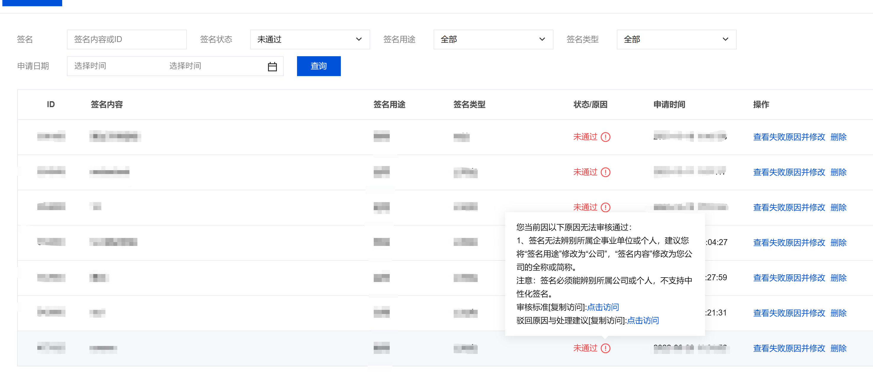 1. 在 签名管理 页面,您可以查看签名信息,具体包括签名 ID、签名内容、签名用途、签名类型、状态/原因、申请时间。