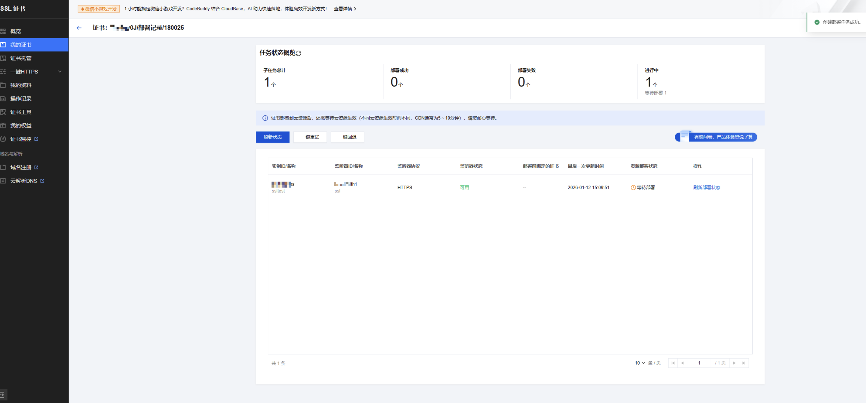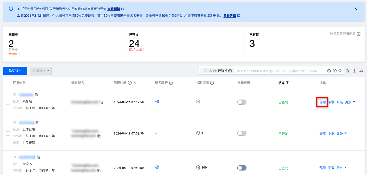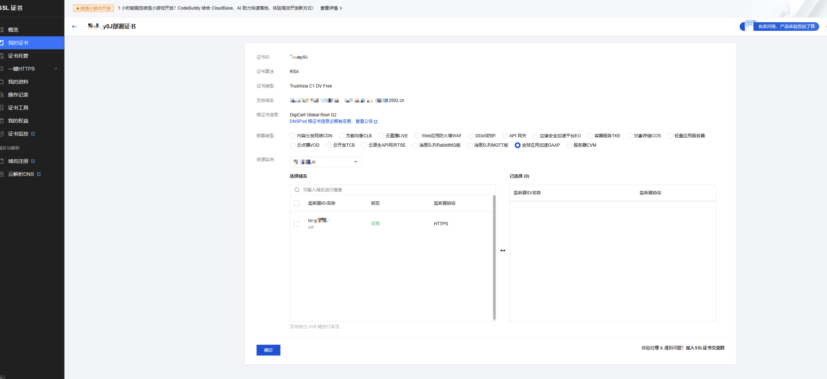 ,选择您需要部署的证书,并单击
