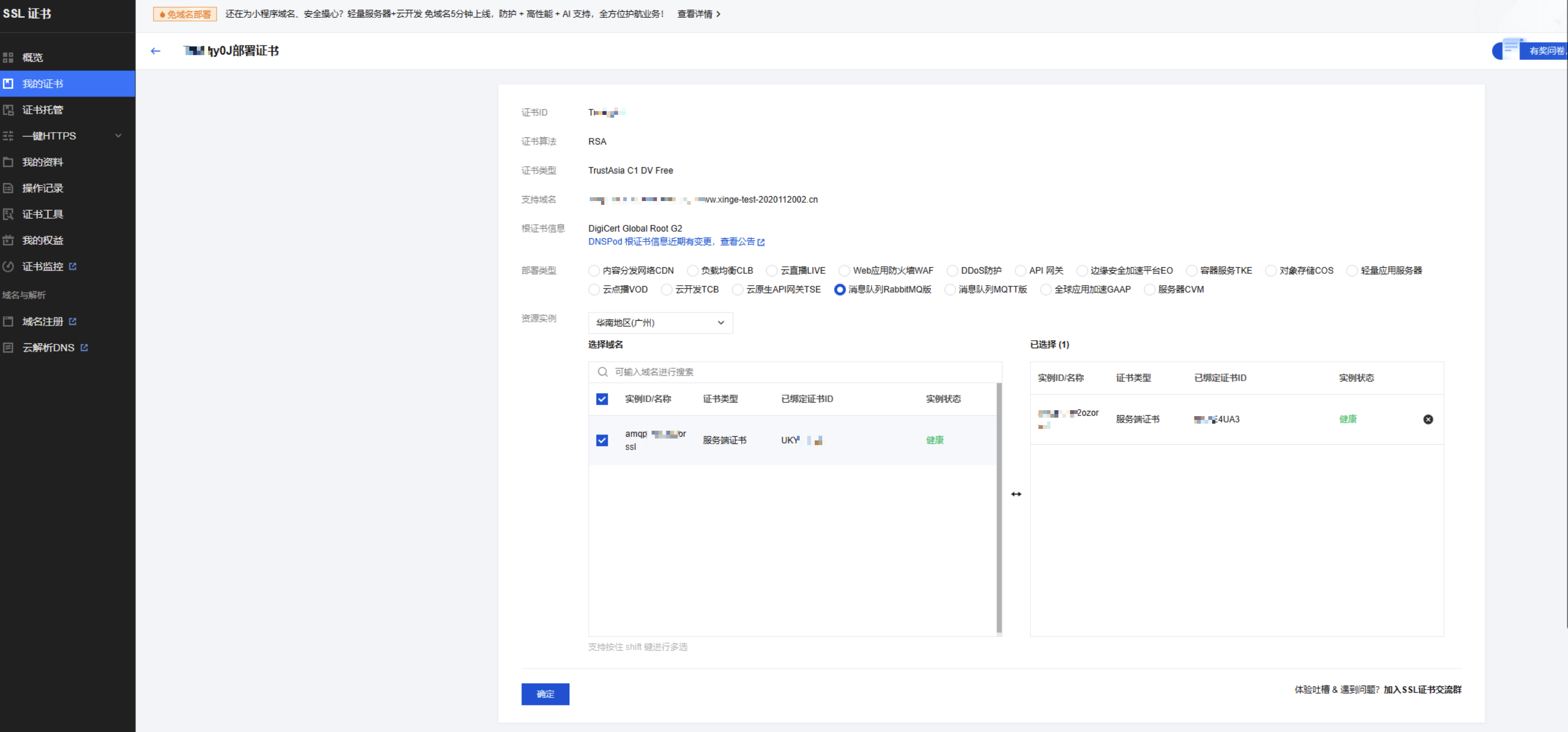 2. 在证书部署页面,部署类型选择消息队列 RabbitMQ 版,并选择跟证书域名匹配的实例后,单击确定。