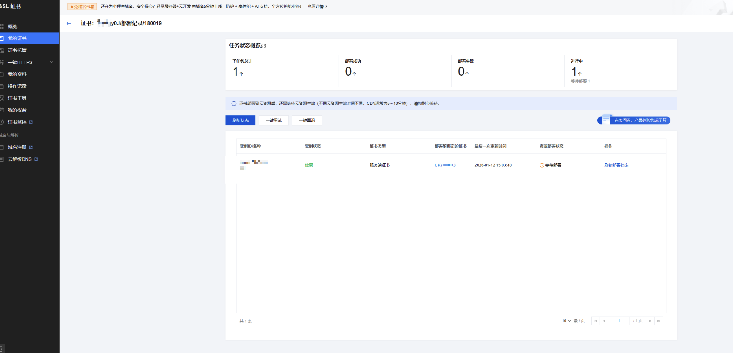 若部署错误,您可通过一键回退功能将云资源回退到这次部署前的证书。