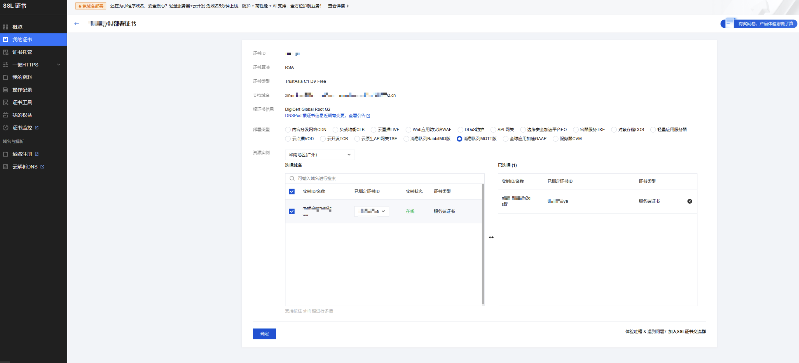 2. 在证书部署页面,部署类型选择消息队列 MQTT 版,并选择跟证书域名匹配的实例后,单击确定。