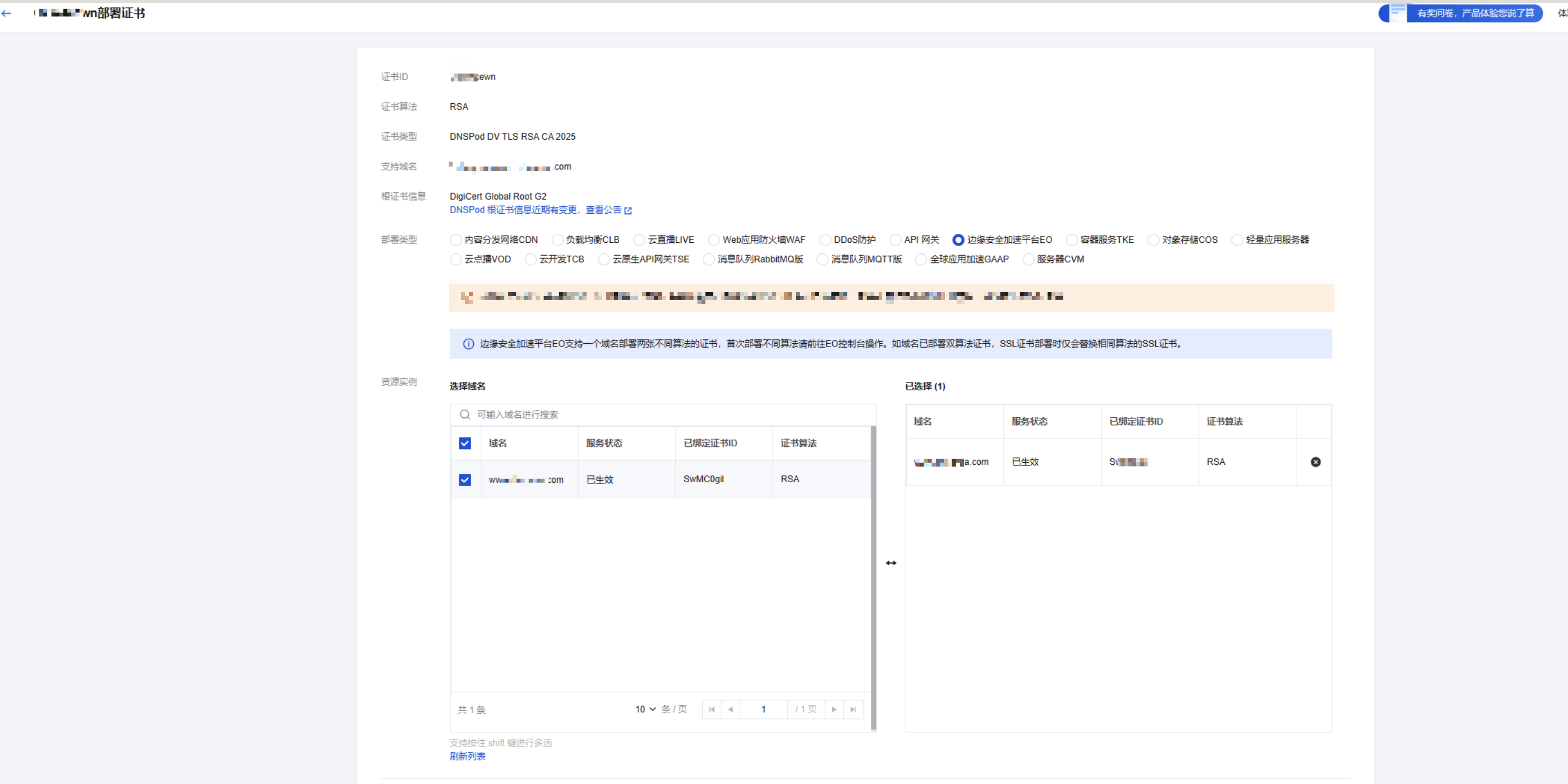 ,选择您需要部署的证书,并单击