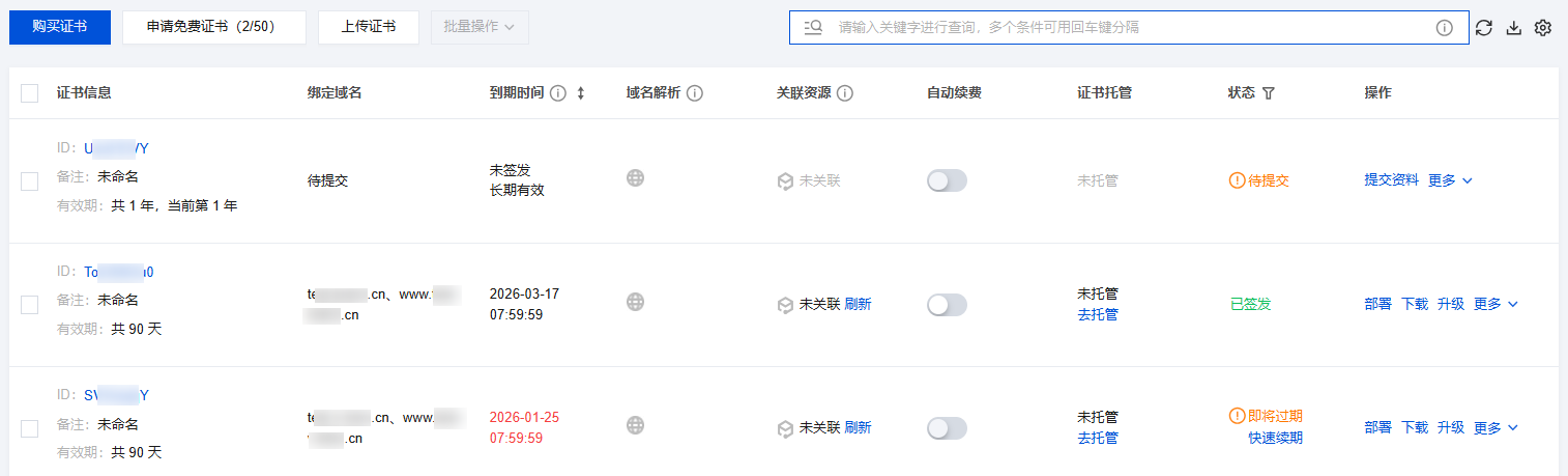 1. 免费证书在过期前30天会开启快速续期通道,您可在 SSL 证书控制台 > 我的证书页面,单击对应证书的状态栏中快速续期,即可打开免费证书快速重新申请页面。如下图所示: