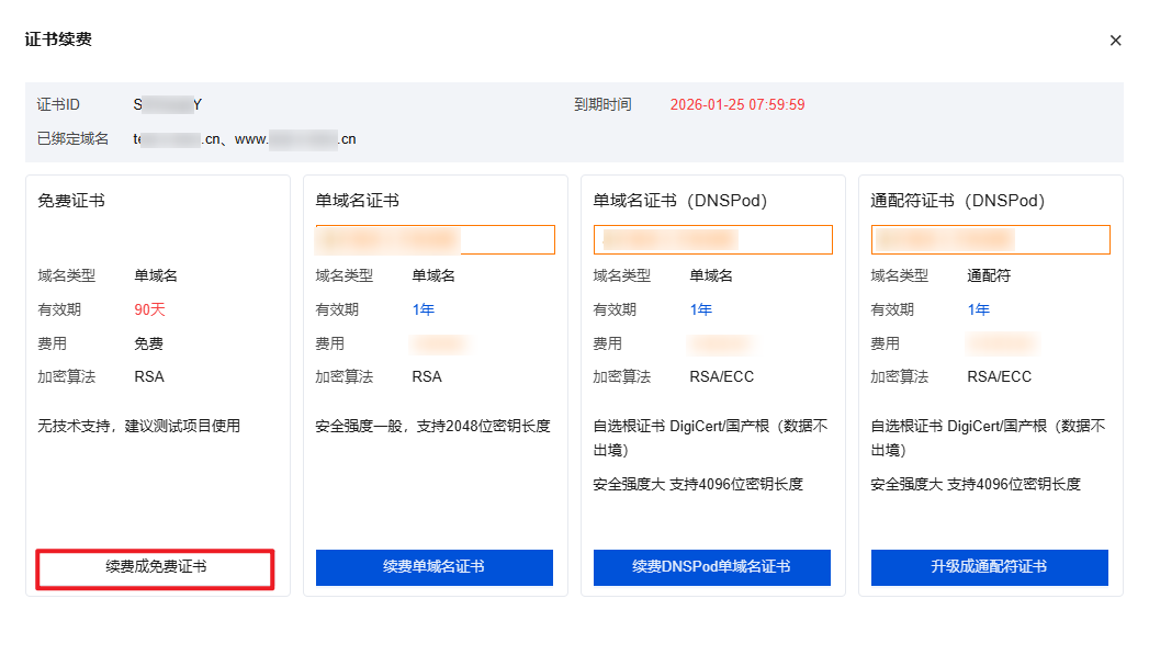 2. 在弹出的证书续费页面,单击续费成免费证书。