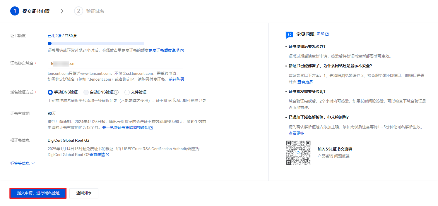 3. 在提交证书申请页面,请确认您的申请信息,并选择对应的域名验证方式,单击提交申请进行,域名验证,即可进入验证域名页面。如下图所示: