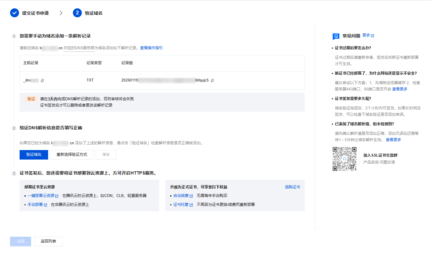 域名验证方式为手动 DNS 验证:验证方法请参见 DNS 验证。