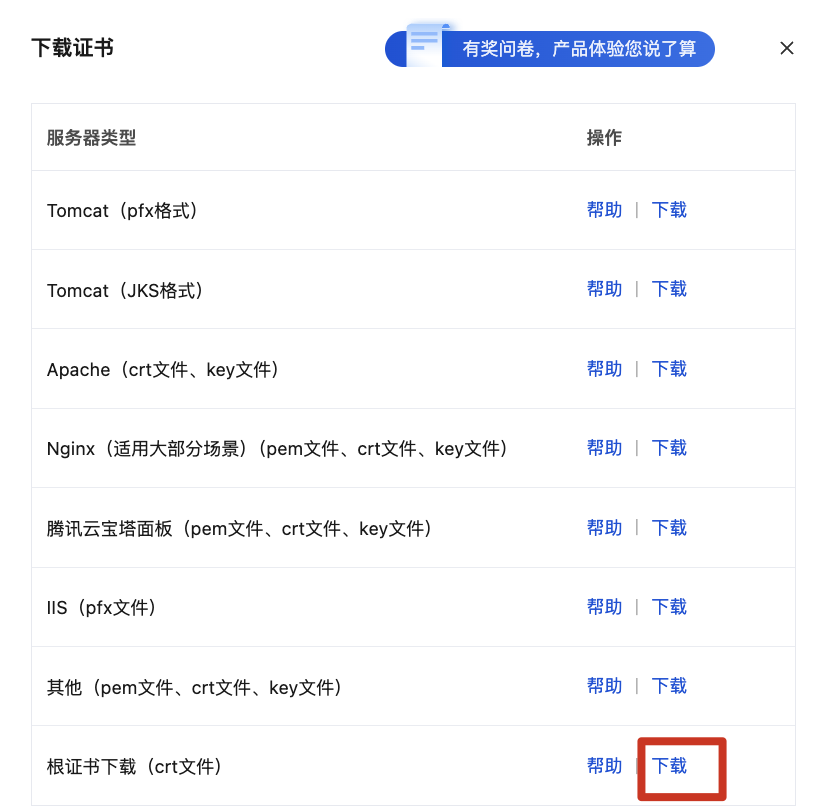 3. 在弹出的下载证书窗口中,找到根证书下载,单击下载,即可下载根证书,如下图所示: