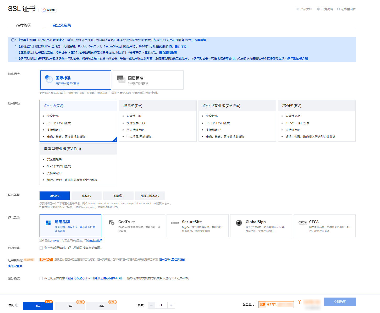 3. 如果您需指定证书品牌,可进入自定义选购页面,根据您的诉求自定义配置证书规格,如下图所示: