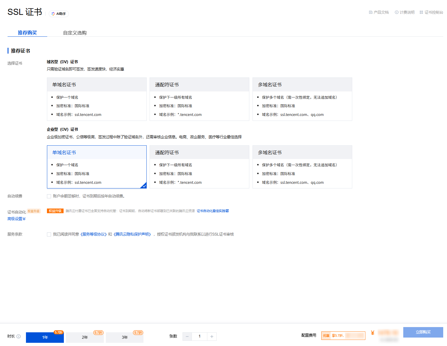2. 若您无需指定证书品牌,可在推荐购买页签选购性价比最高的 SSL 证书,如下图所示: