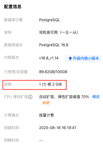 当实例的监控指标 CPU 利用率的平均值达到设置的自动弹性扩容阈值时,该实例会自动扩容。您可在实例详情页的实例配置后查询是否生效,若规格中 CPU 核数后额外显示(实际核数),则表示生效。如下图所示,1(2)核表示当前已经是自动扩容到了2核。
