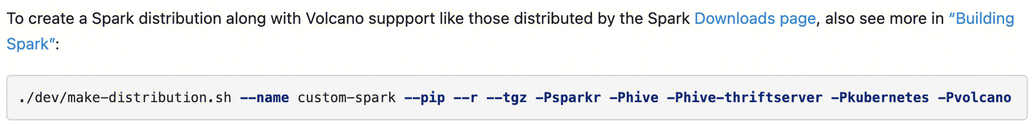 因为需要通过 spark-submit 使用 Volcano 相关高级特性,需要参阅 Apache Spark 文档中 https://dlcdn.apache.org/spark/docs/3.3.2/running-on-kubernetes.html#build 小节,重新编译部署的 spark 版本:
