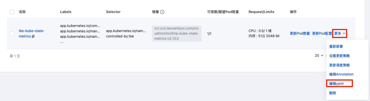 3. 在左侧导航栏选择工作负载,选择 StatefulSet 页面,在需要更新 YAML 的 StatefulSet 行中,选择更多 > 编辑 yaml。如下图所示: