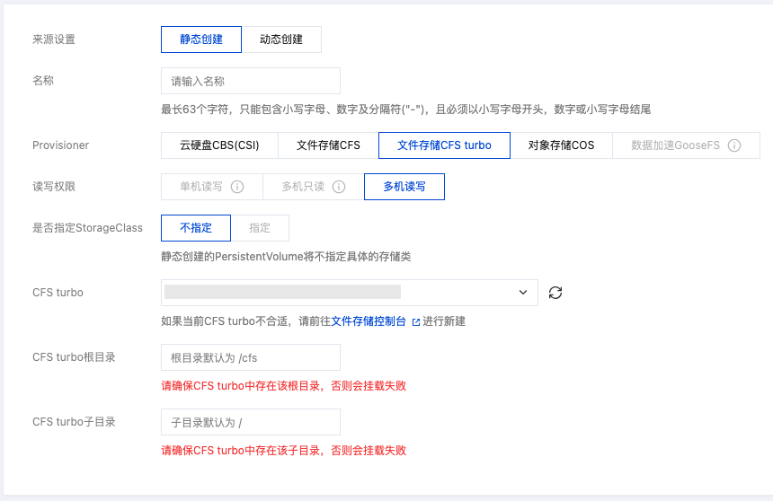 Provisioner | 此处选择文件存储 CFS Turbo。 |