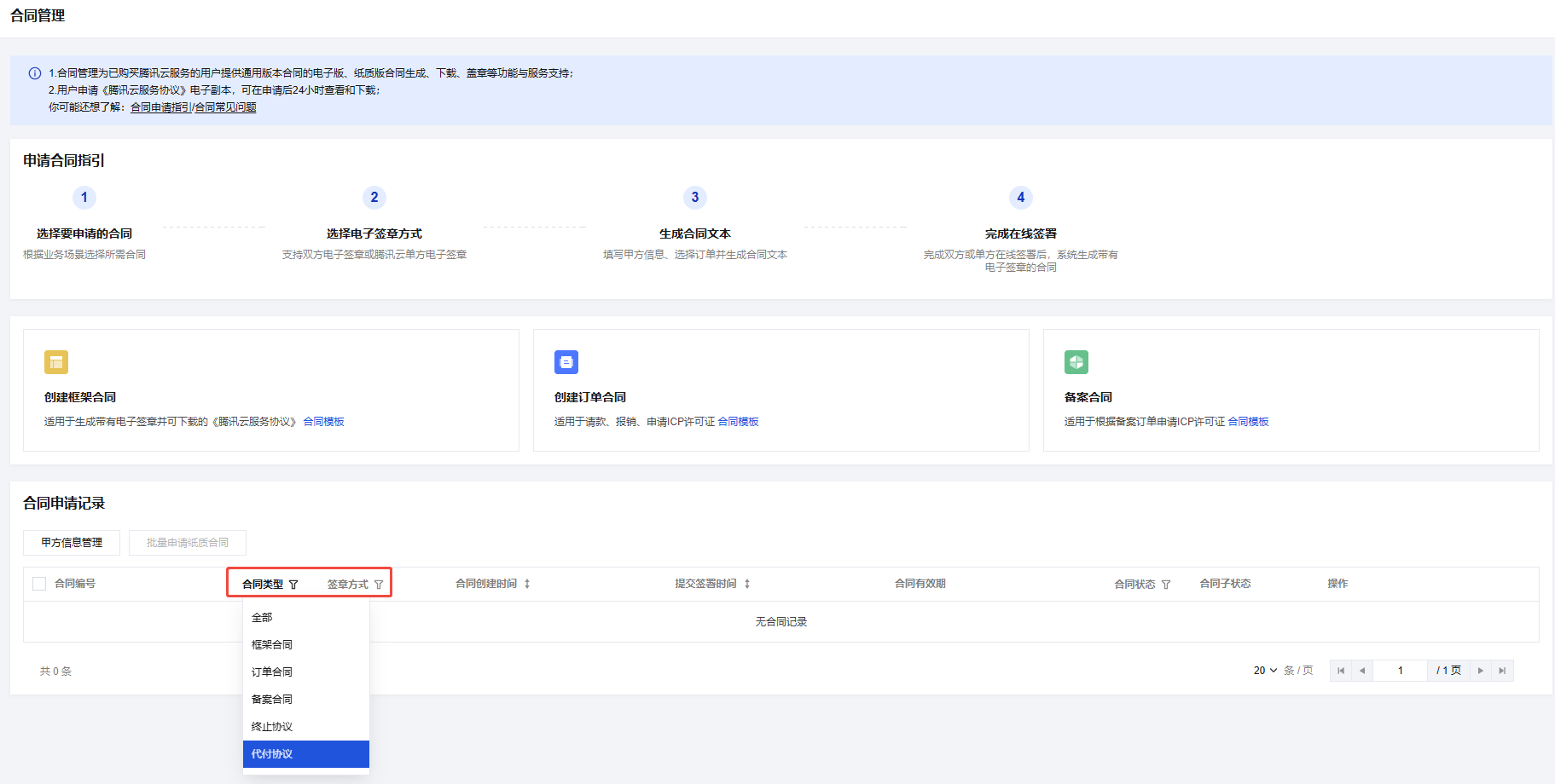 2. 在合同管理页面,单击合同类型,选择代付协议,或者单击签章方式,选择三方电子签,即可准确搜索已创建的代付协议。