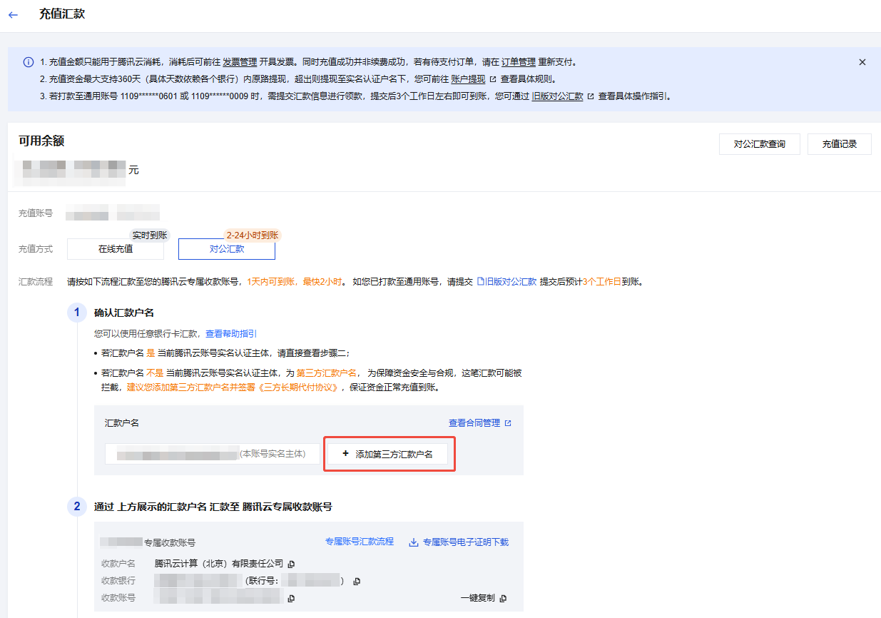 当您需要使用与实名认证主体不一致的银行账户进行对公汇款时,通过签署《三方长期代付协议》才可直接向您的腾讯云专属账户或腾讯云旧版对公汇款账号进行汇款充值。