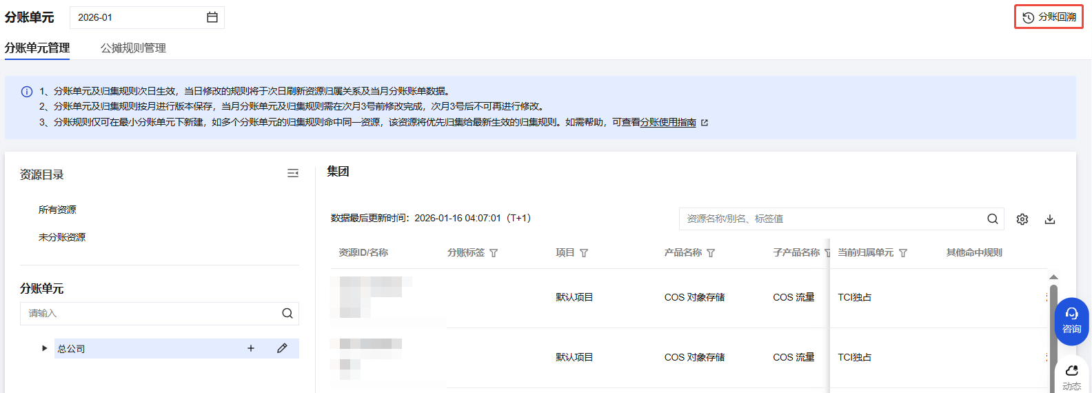 分账单元及归集规则 T+1 生效,当日修改的规则将于次日刷新资源归属关系及当月分账账单数据。