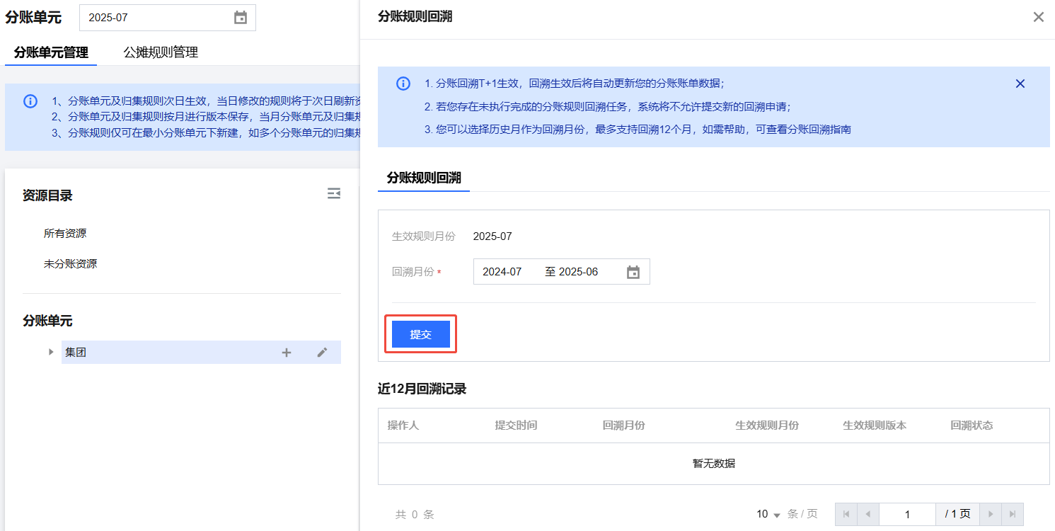 为满足客户对历史账单按最新分账规则重新核算的需求,现推出分账回溯功能。该功能支持用户基于当前分账规则,对历史月份账单进行灵活调整与重新计算,实现账单数据的动态拆分与重组,帮助用户更精准地掌握和分析分账情况。提升财务管理的准确性和灵活性,助力企业实现更精准的成本分析与账务管理。