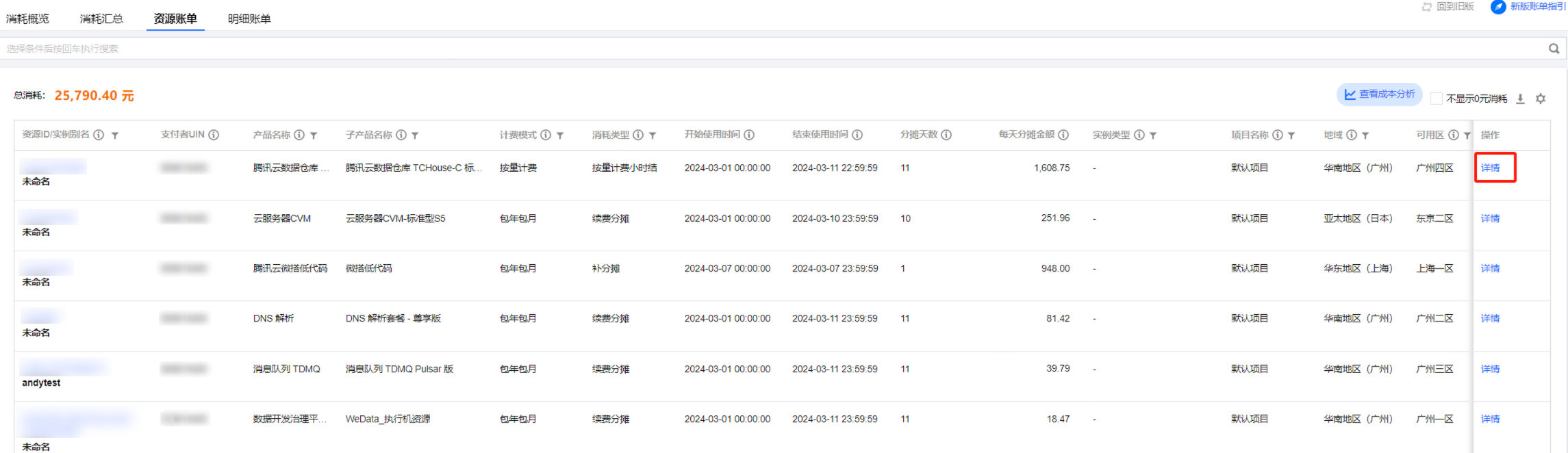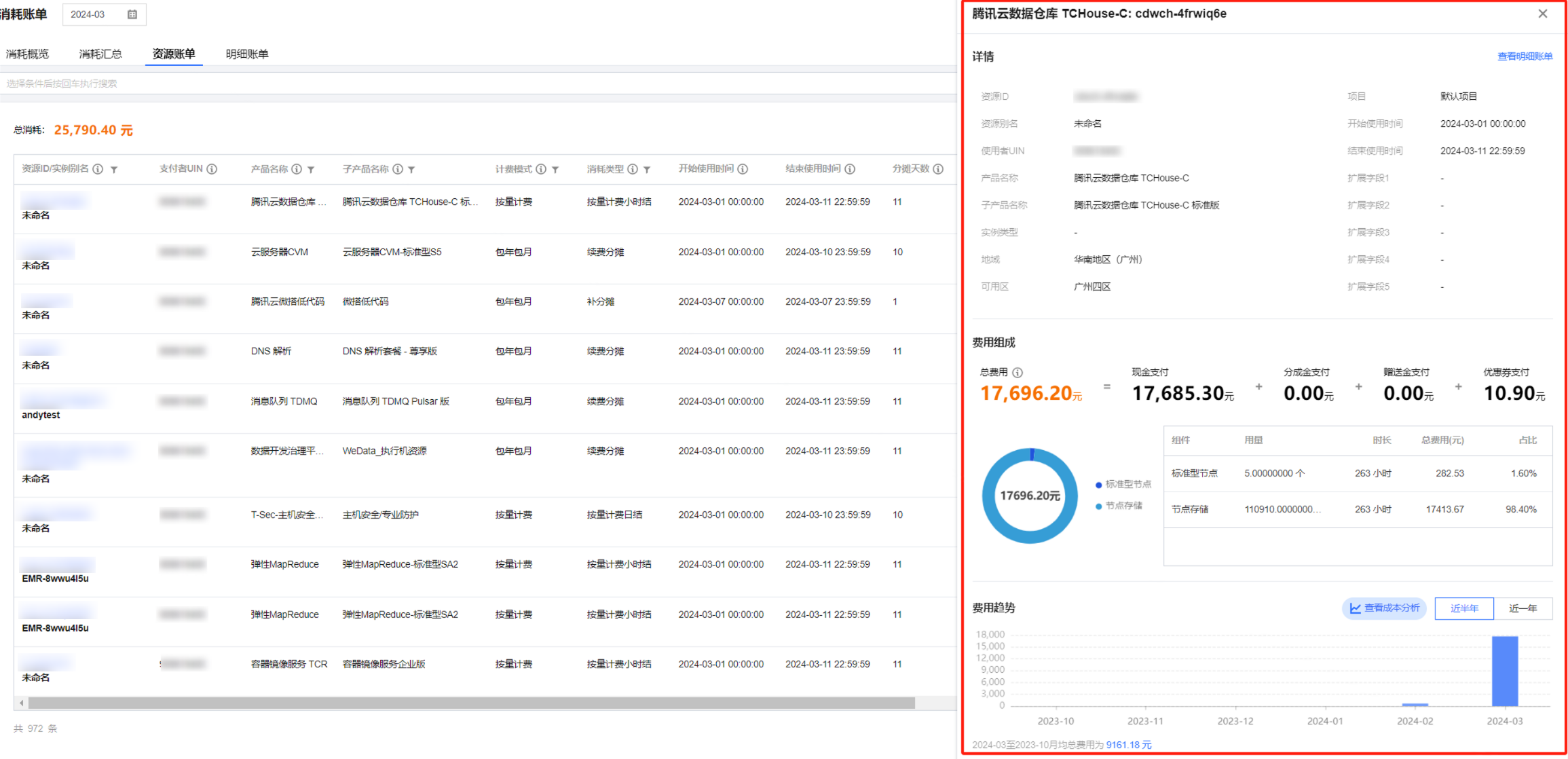 详情:单击各资源操作列详情,即可查看该资源详情、费用组成、近半年/一年的费用趋势。