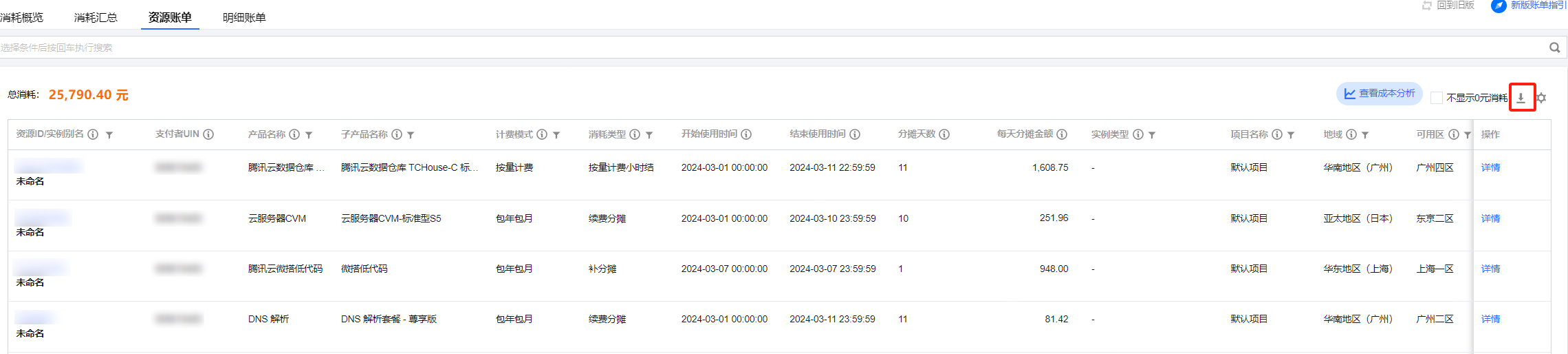 根据资源 ID 进行汇总的月度消耗,支持查看和导出数据。也支持多维度筛选和导出筛选结果资源消耗数据详情。