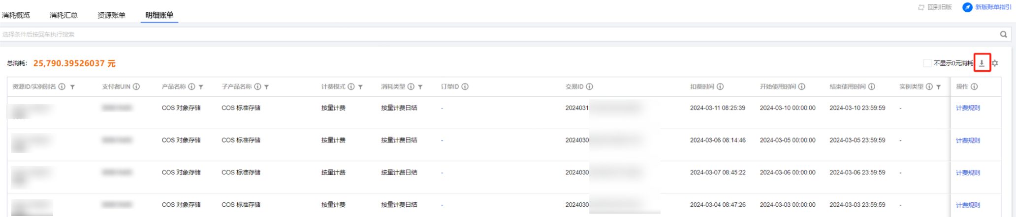 明细账单是最细粒度的消耗数据,预付费按天展示消耗详情,后付费按每条扣费记录展示消耗详情。支持查看和导出账单明细数据。