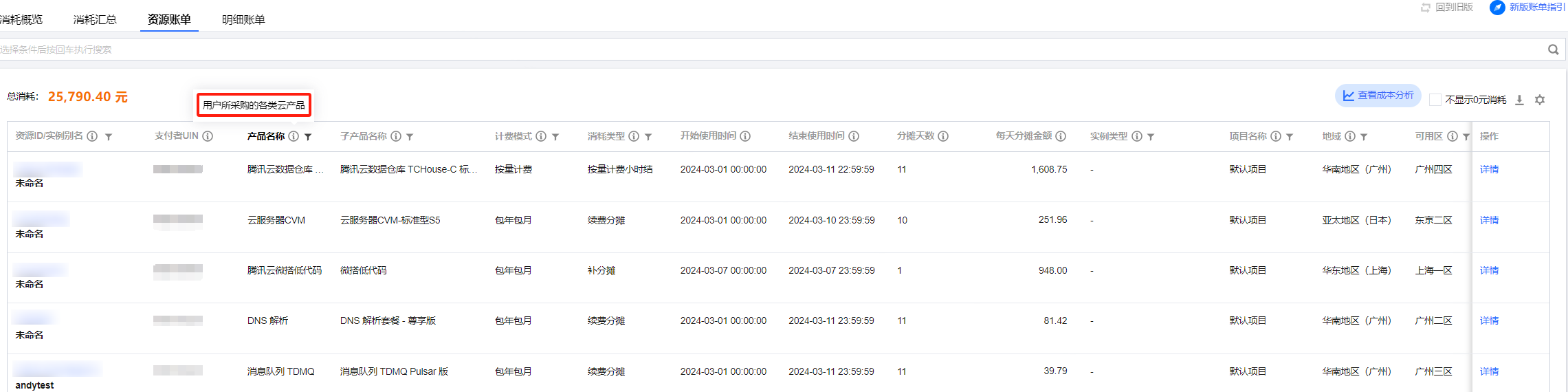 展示多维度消耗汇总情况。支持按产品名称、按项目、按地域、按计费模式、按标签查看消耗汇总数据。