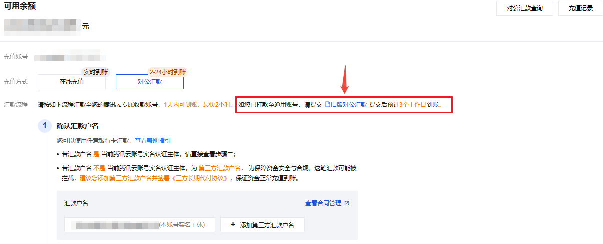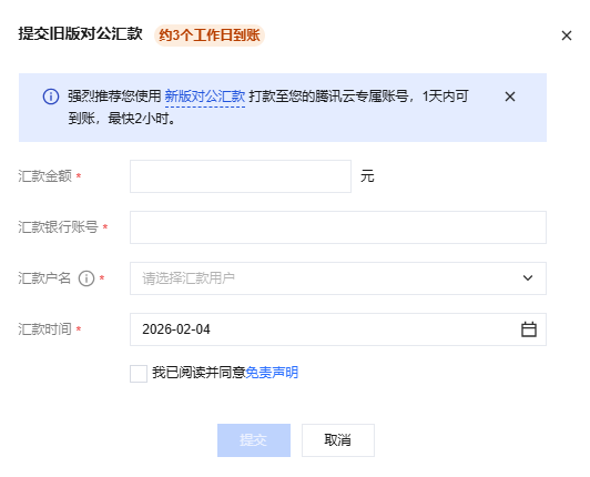 旧版线下汇款是客户在打款至腾讯云指定收款账号后需要登录腾讯云控制台提交汇款信息的一种充值方式。