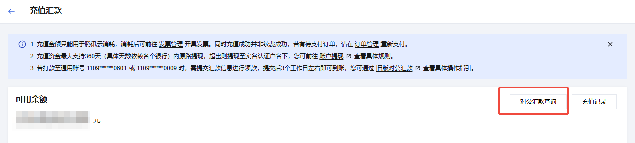 打款后,必须在“腾讯云控制台 > 费用中心 > 充值汇款 > 对公汇款”页面提交汇款信息,否则充值款项无法充值到账。