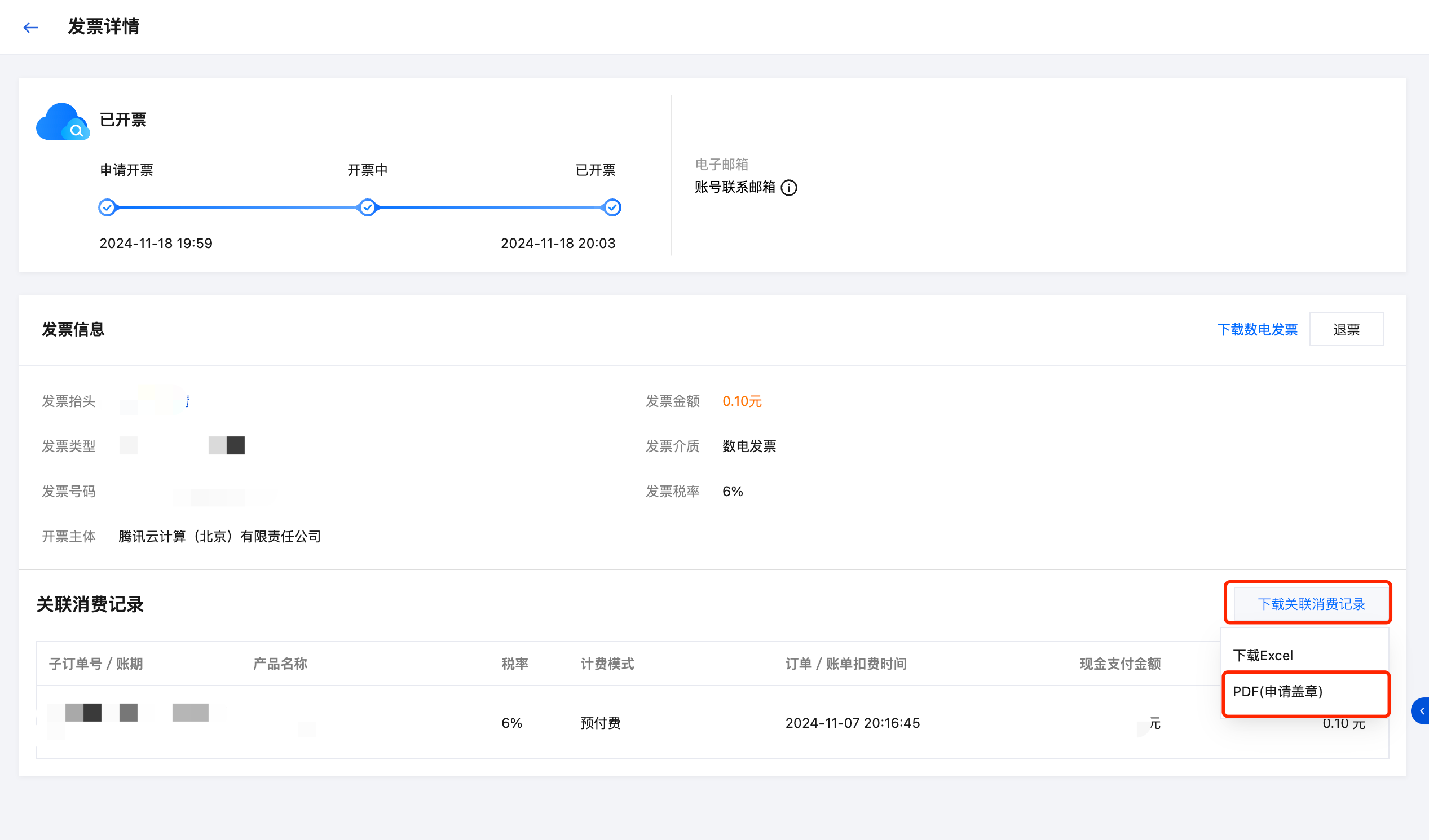 在发票详情页,也可以下载发票关联的消费记录,支持 Excel 和加盖电子章的 PDF 版本。
