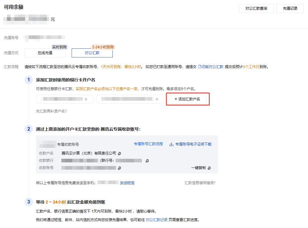 户名模式:腾讯云账户允许客户使用汇款页面已添加户名的汇款账户进行汇款,请您在打款前完成 “添加户名”操作再进行汇款。
