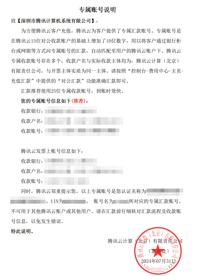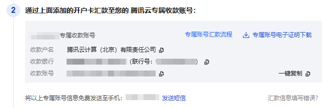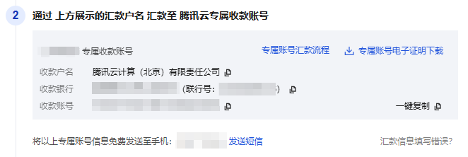 每个腾讯云用户都有一个唯一专属的、固定的对公汇款专属账号(25位,即前15位固定数字+后10位专属识别码)。