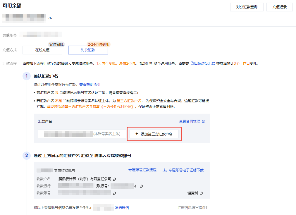 收款户名:腾讯云计算(北京)有限责任公司中的括号为中文全角符号。打款时请务必注意填写格式,防止因户名格式错误影响充值进度。