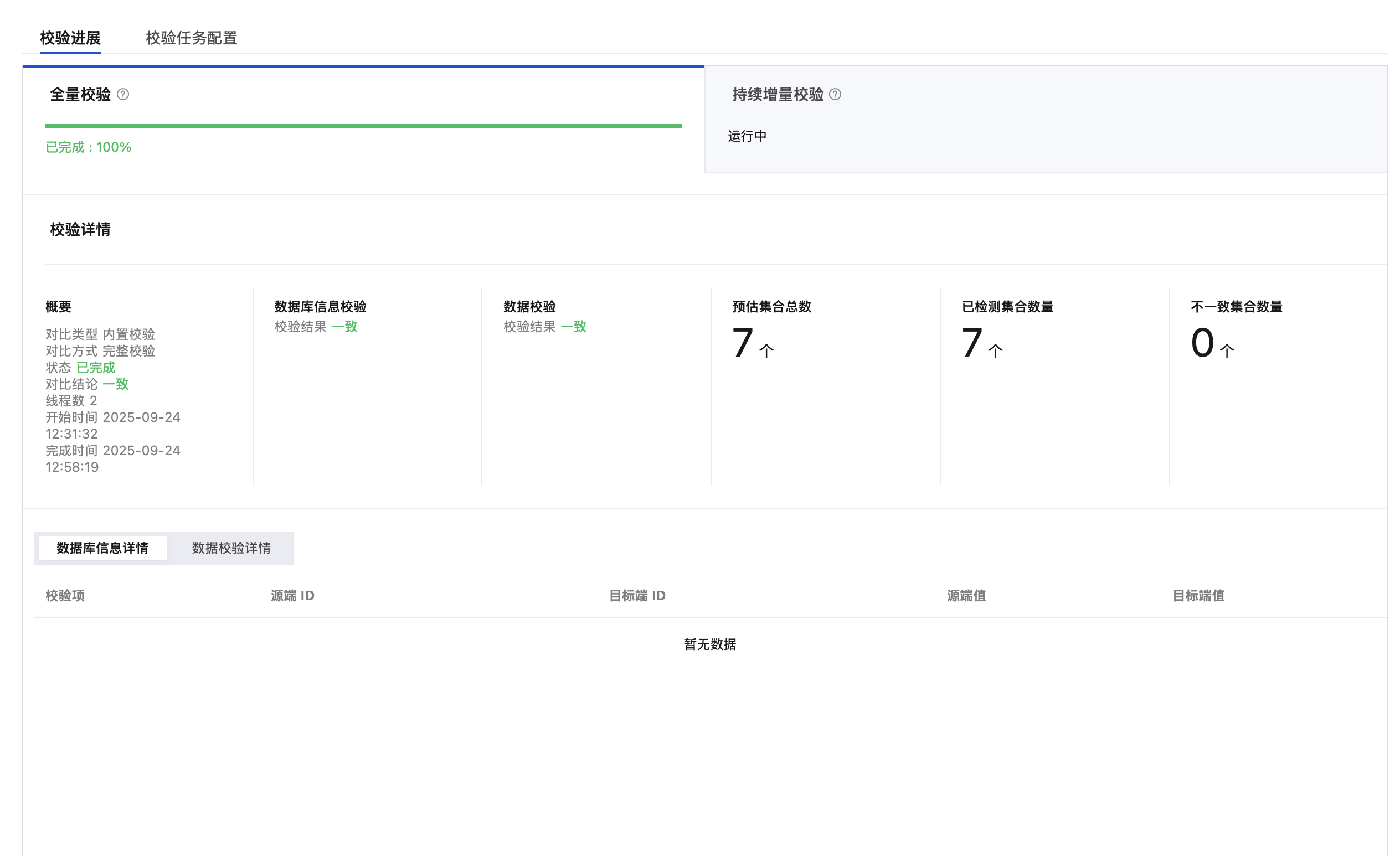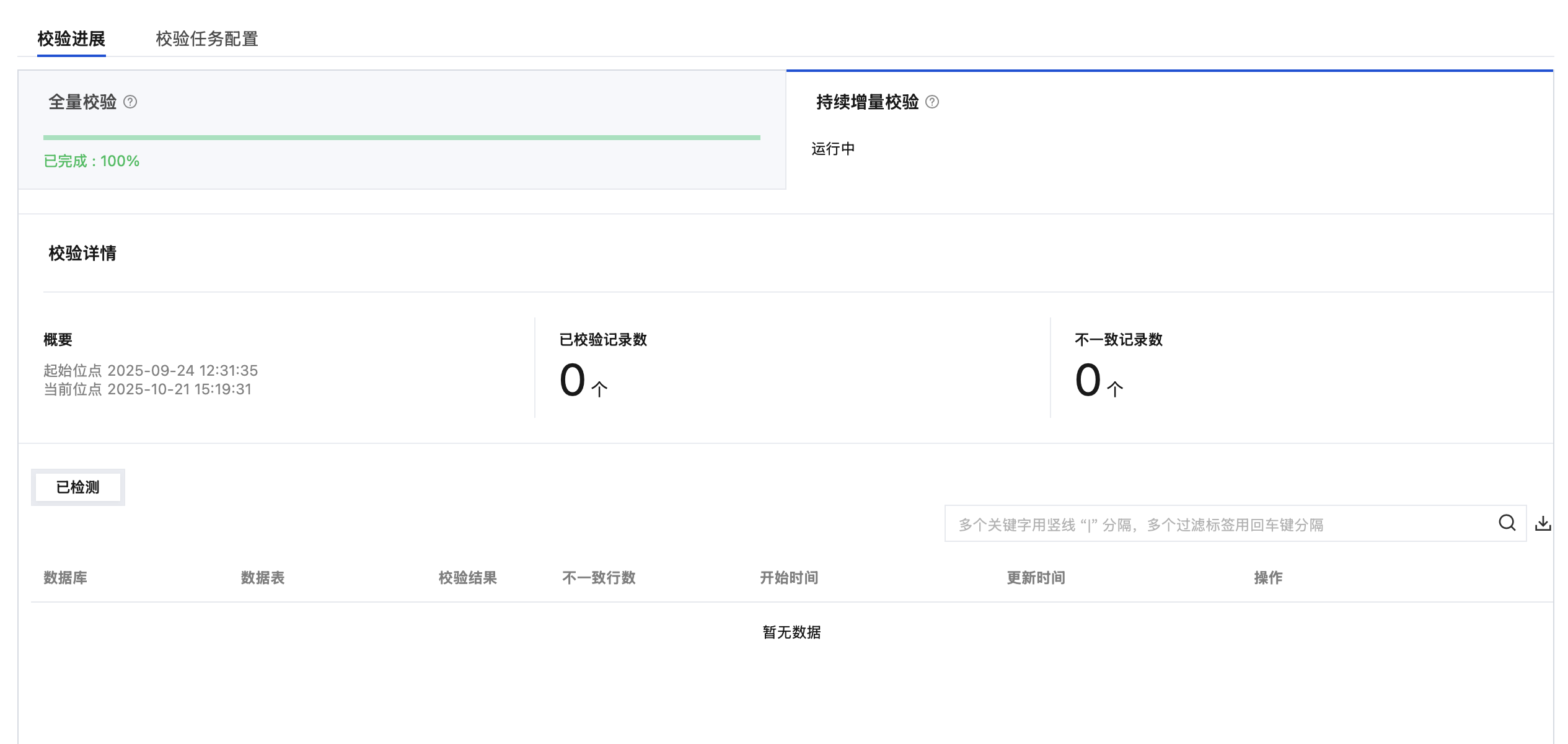 数据校验 | 校验结果:当前数据校验结果,为不一致或者一致。 |