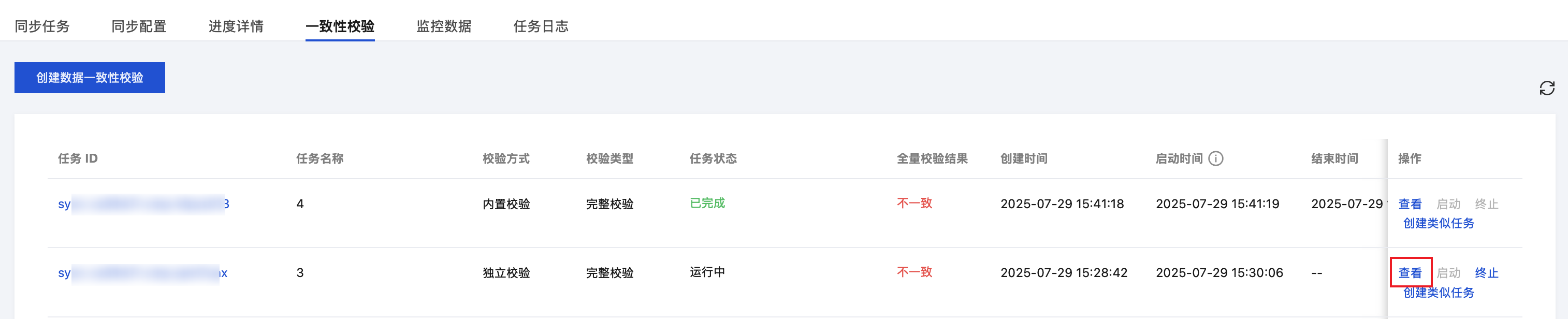 1. 在数据同步页面,选择需要查看的同步任务,在操作列选择更多 > 创建数据一致性校验。
