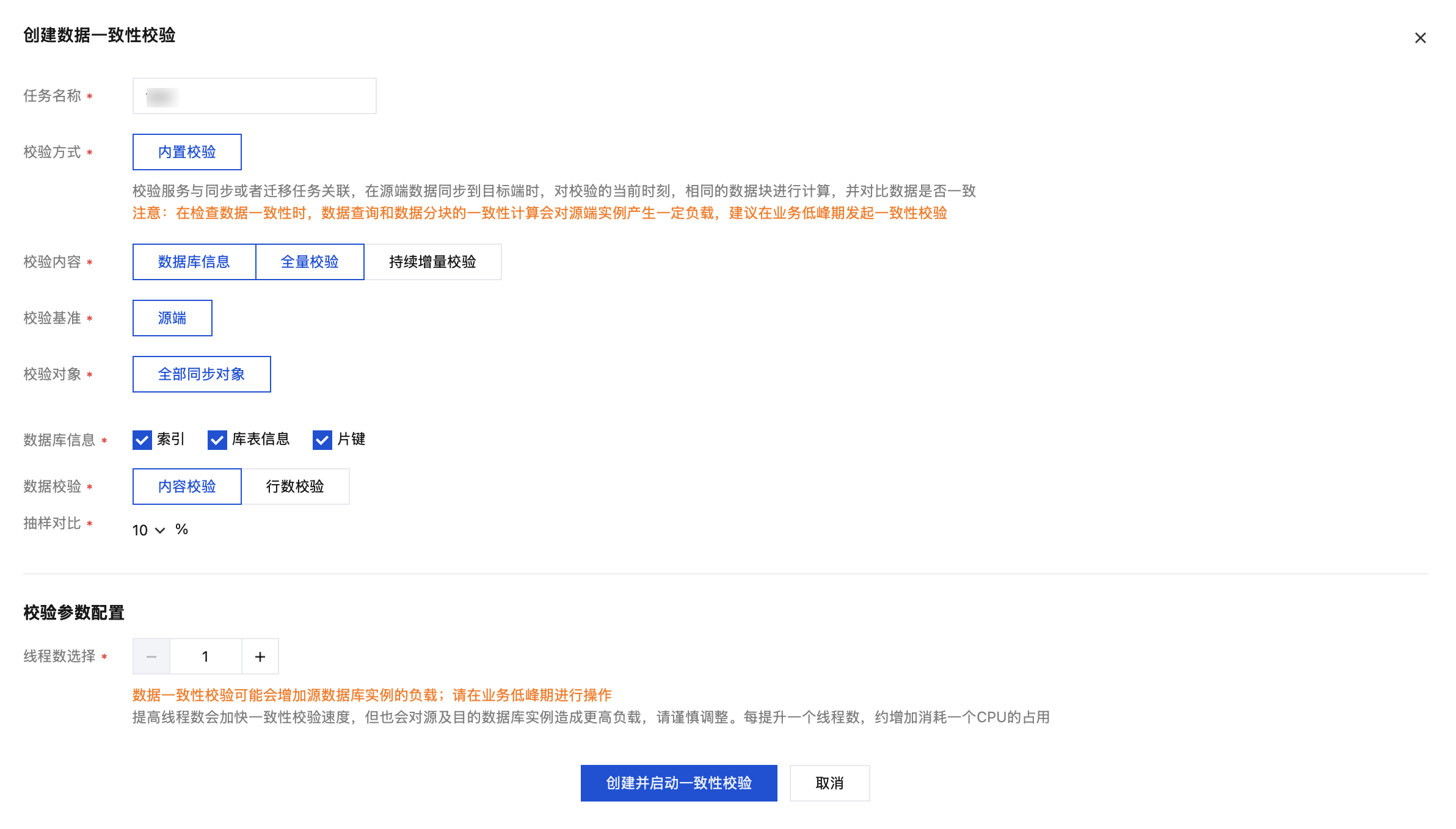 4. 在弹出的对话框中,配置数据一致性校验参数后,单击创建并启动一致性校验。