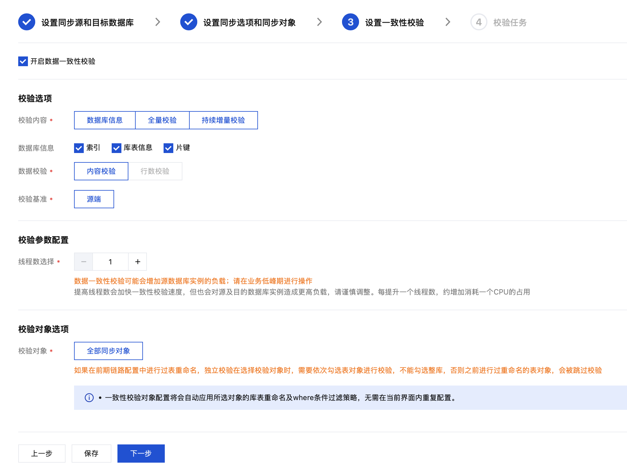 校验参数配置 | 线程数选择 | 设置范围为1~8,请根据实际情况选择,提高线程数可加快一致性校验速度,但也会增加源和目标库的负载。 |