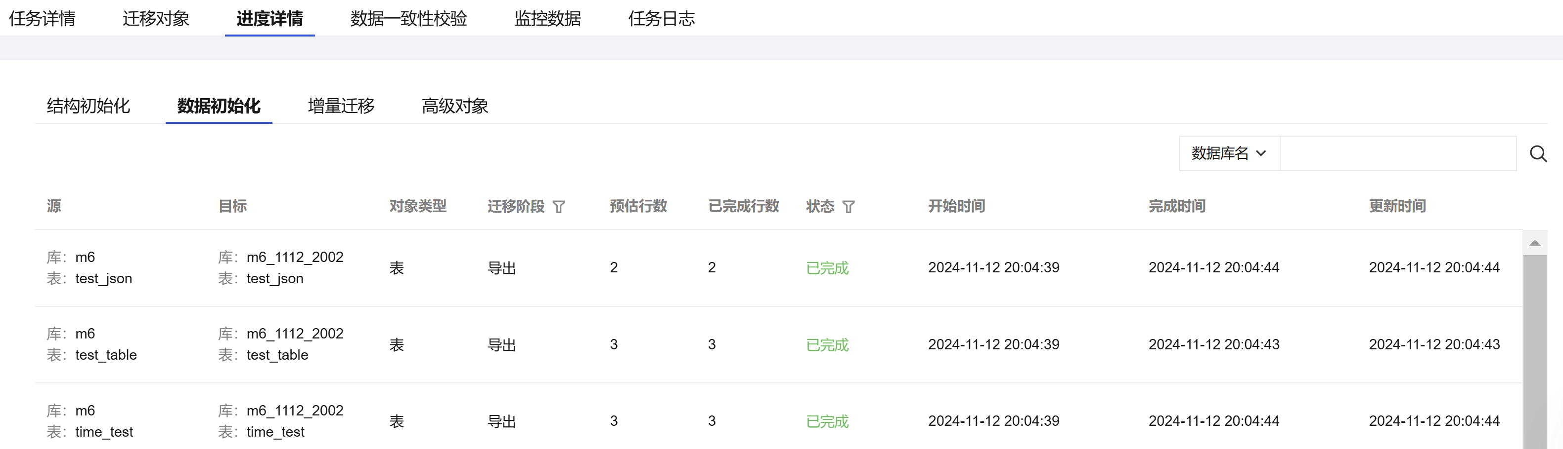 显示数据迁移的详情,表对象的预估行数,已完成行数,迁移状态等。