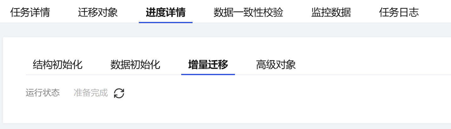 数据迁移任务创建成功后,可查看迁移任务详情(包括源数据库信息、目标数据库信息、迁移类型)、迁移对象、迁移进度详情等。