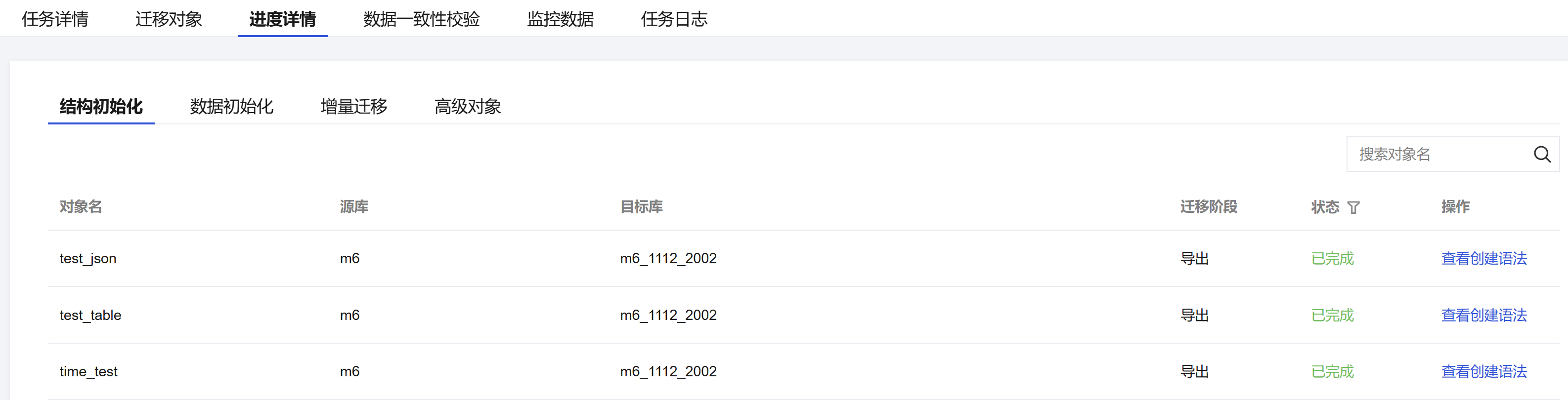 显示结构迁移的详情(表,视图的结构迁移信息展示在此页签),每个对象的迁移状态,创建语法等。