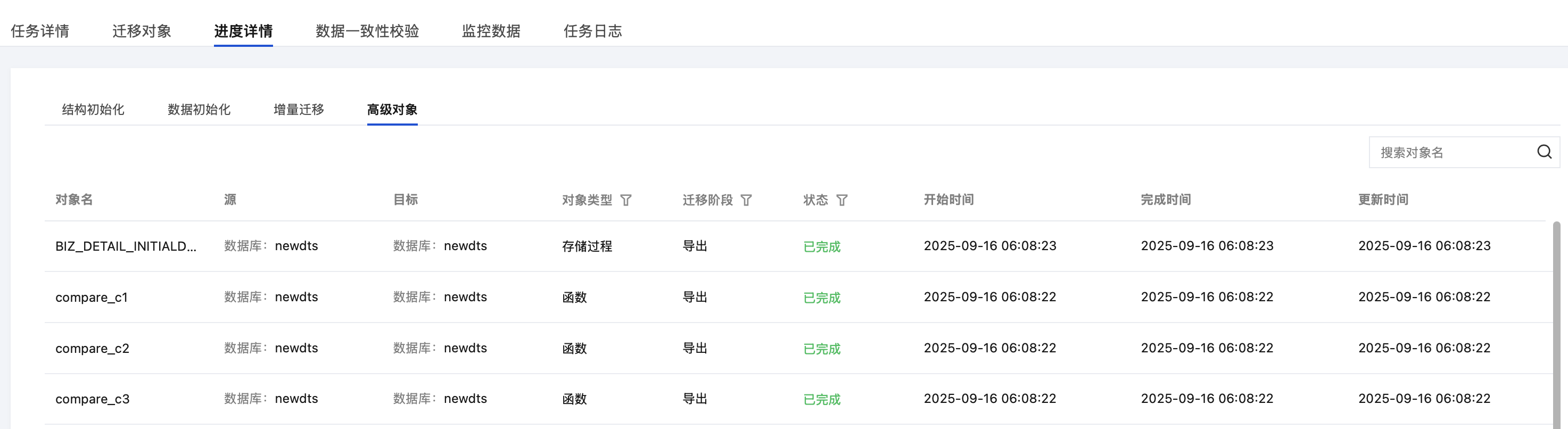 显示高级对象的迁移详情,每个对象的迁移状态,完成时间等。