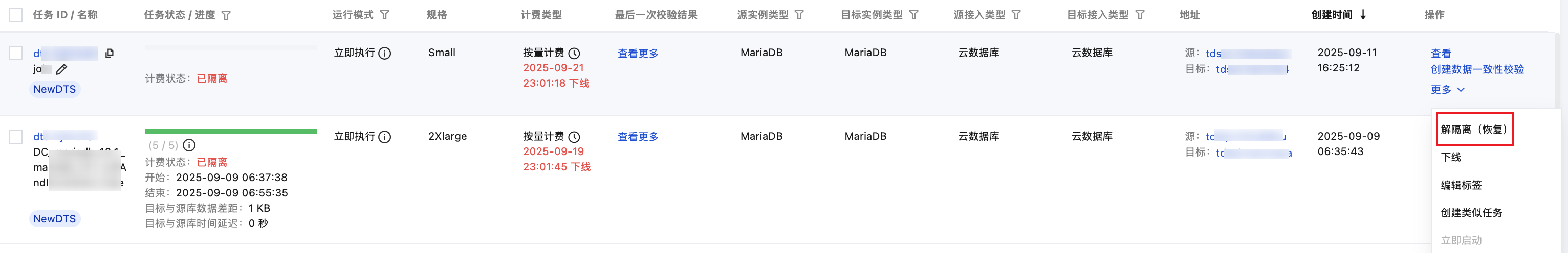 仅新版本 DTS 迁移任务支持用户自助解隔离,老版本 DTS 迁移任务不支持用户自助解隔离。