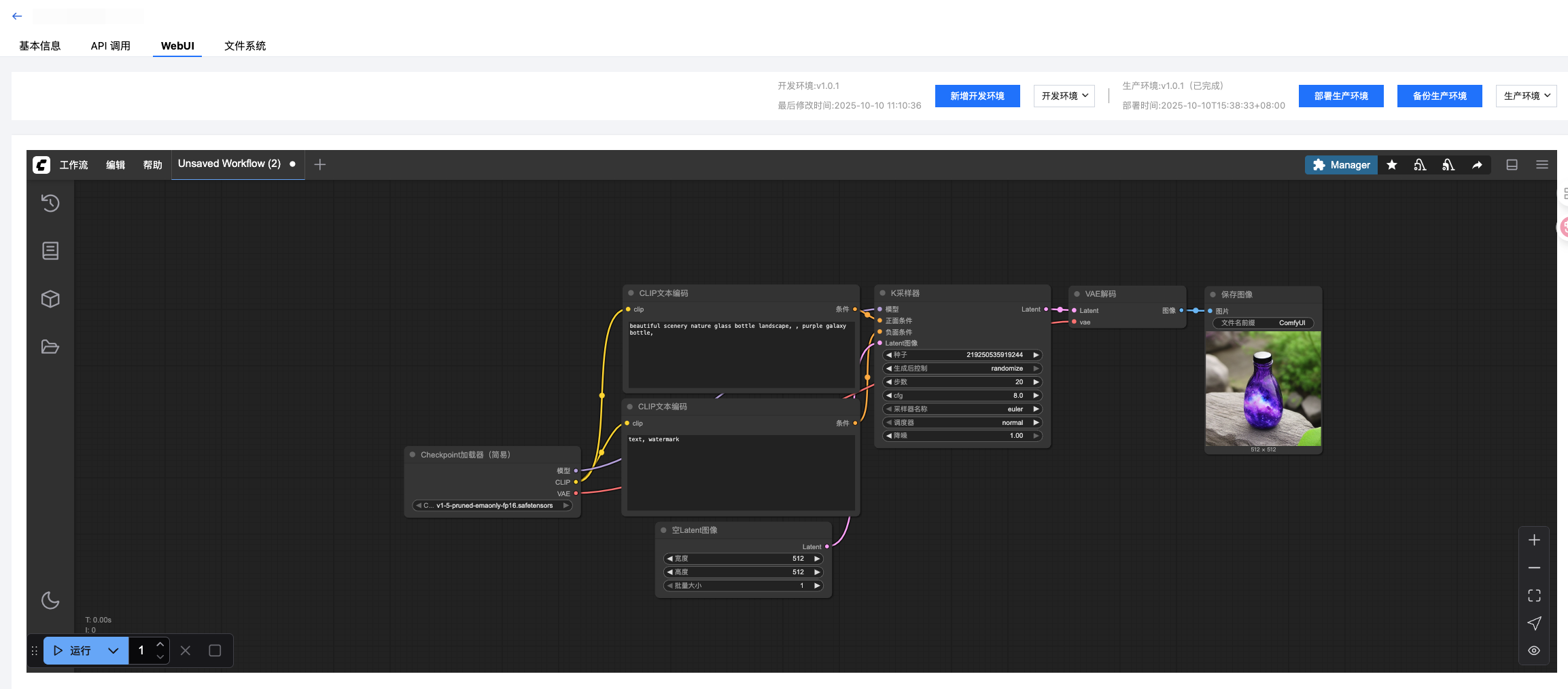 6. 应用创建完成后,在 WebUI 页面,设置提示词,单击运行,完成出图。