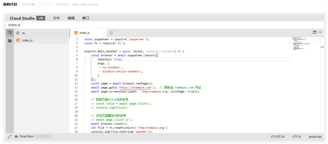 在函数配置页中,单击展开函数代码卡片查看核心代码。这是一个完整可运行的示例,实现了引用 puppeteer 实现对网页内容截屏,并转换为 base64 打印到函数日志的功能: