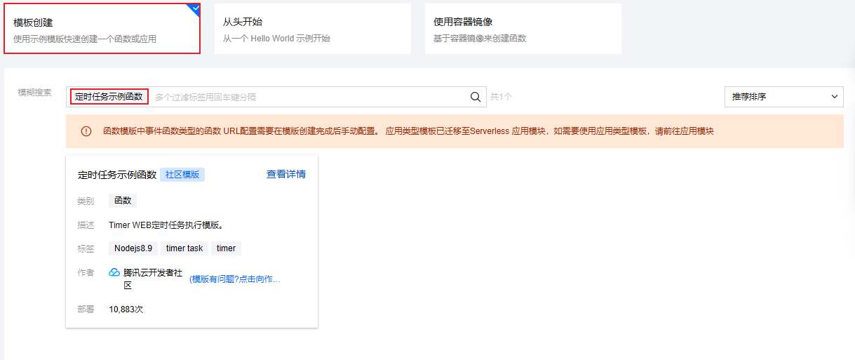 模糊搜索:输入“定时任务示例函数”,并进行搜索。单击模板中的查看详情,即可在弹窗中查看相关信息,支持下载操作。