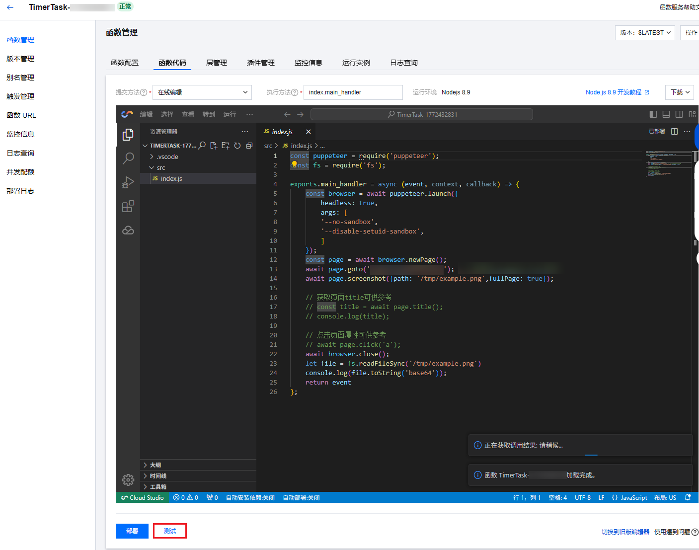 2. 在函数管理 > 函数代码页面,单击代码编辑器下方的测试,查看函数的执行日志。